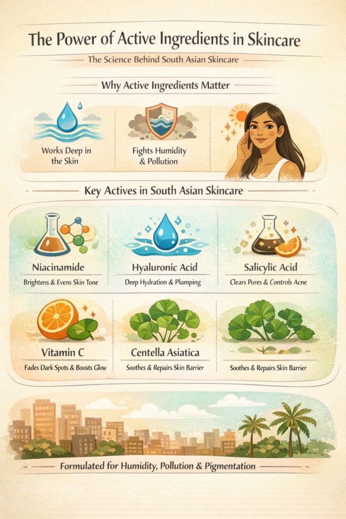 For South Asian skin — which commonly deals with post-inflammatory hyperpigmentation (dark marks left after breakouts), uneven skin tone, oiliness in humid weather, and sensitivity — choosing the right actives isn’t just helpful. It’s essential.