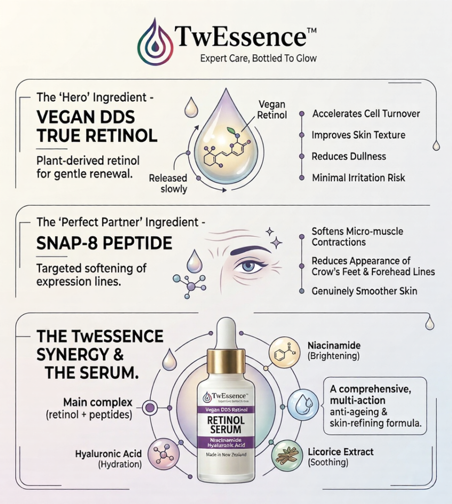 TwEssence uses Vegan DDS True Retinol, a plant-derived form of retinol delivered through a DDS (Drug Delivery System) technology. This encapsulation method controls how the retinol releases into the skin, making it significantly more tolerable while maintaining its effectiveness. You get the cell-renewing, texture-refining benefits of retinol, with a reduced risk of the irritation that puts many people off using it.